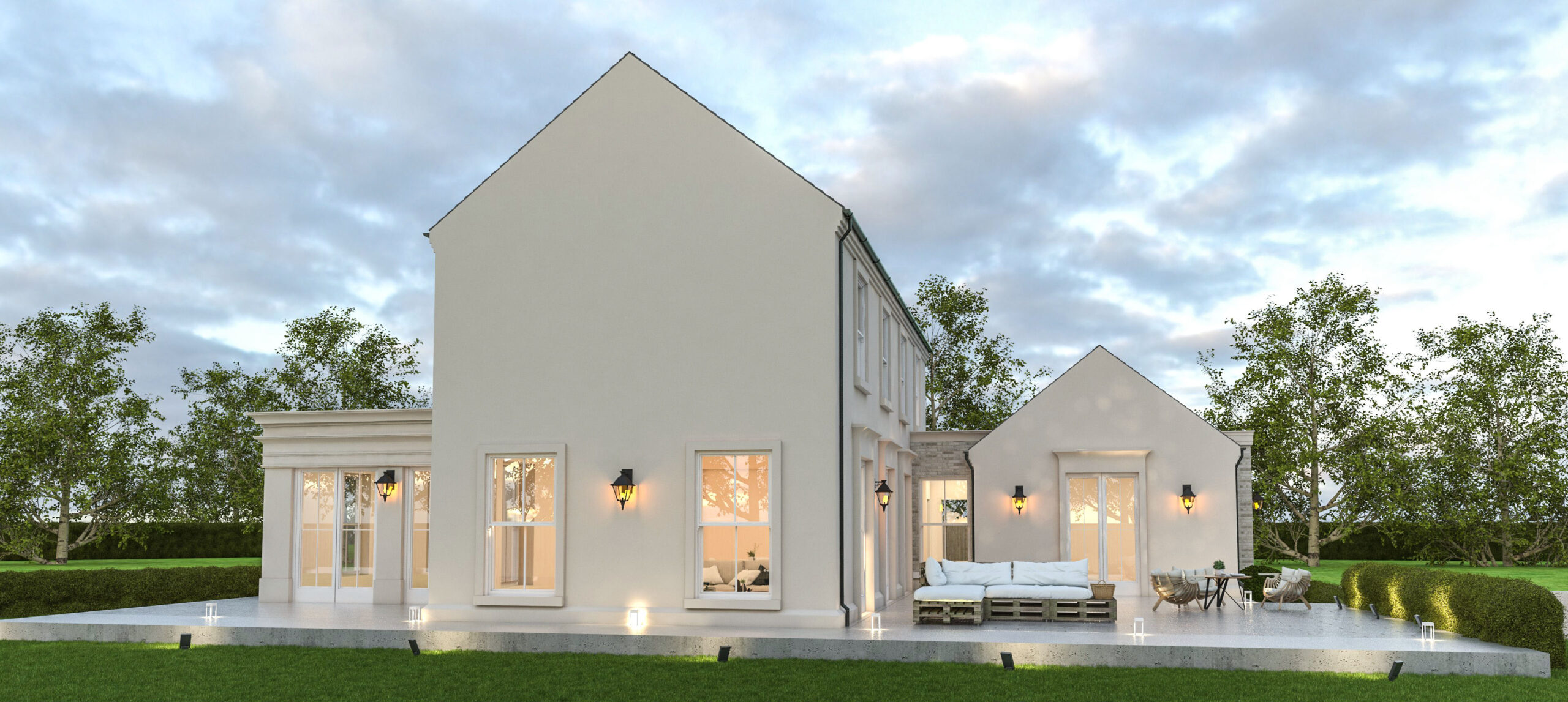 Traditional features such as vertically proportioned sash windows, parapets, and carefully detailed window surrounds reinforce the classic aesthetic. By staggering the two building blocks, a sheltered, south-facing patio was created — offering both sunlight and privacy — and extending the living areas into the garden.