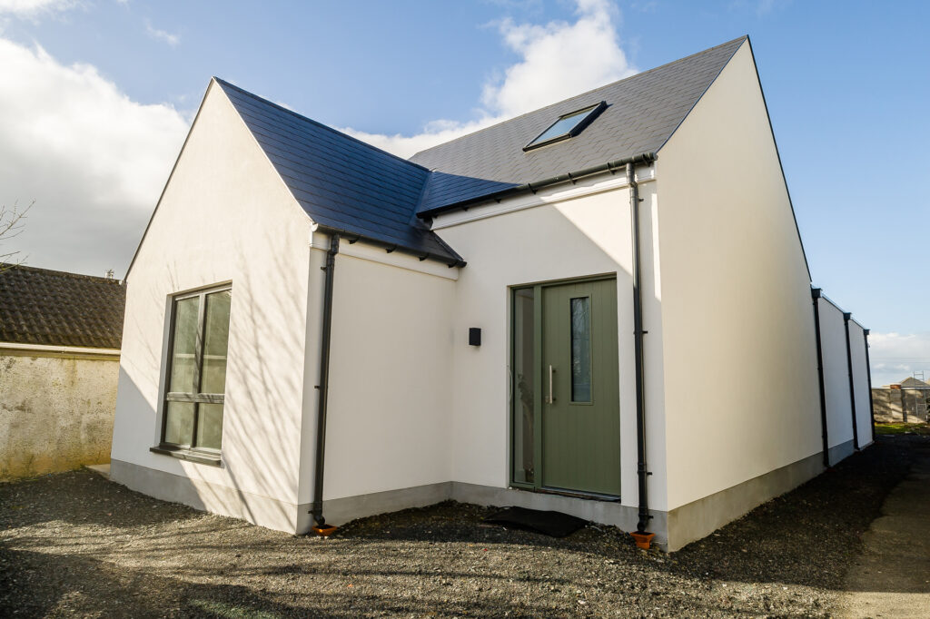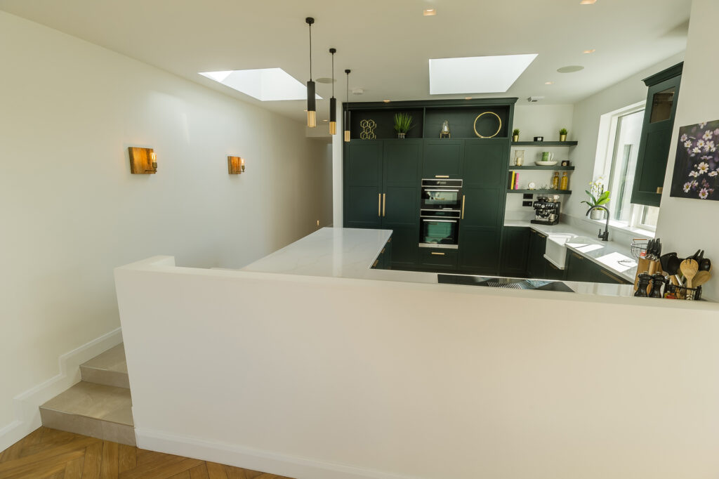 Three distinct roof profiles define the structure: a traditional pitched roof at the front, a contemporary mono-pitch at the rear, and a parapet flat roof connecting them. Inside, a splayed corridor leads into a light-filled open-plan living space, where subtle level changes and varied ceiling heights create distinct zones without partitions.