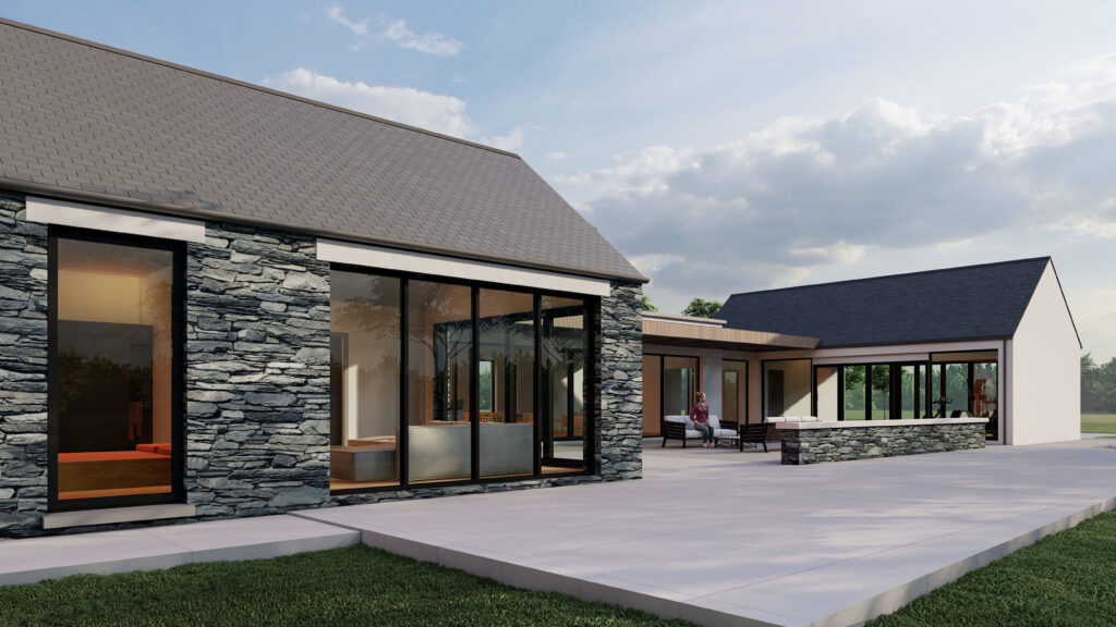 Full-height glazing to the main living areas maximises passive solar gain in winter months, while deep roof overhangs and timber louvres prevent overheating in summer. The combination of thick stone walls, carefully positioned openings, and cross ventilation strategies ensure the home remains thermally comfortable across all seasons.