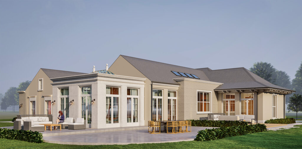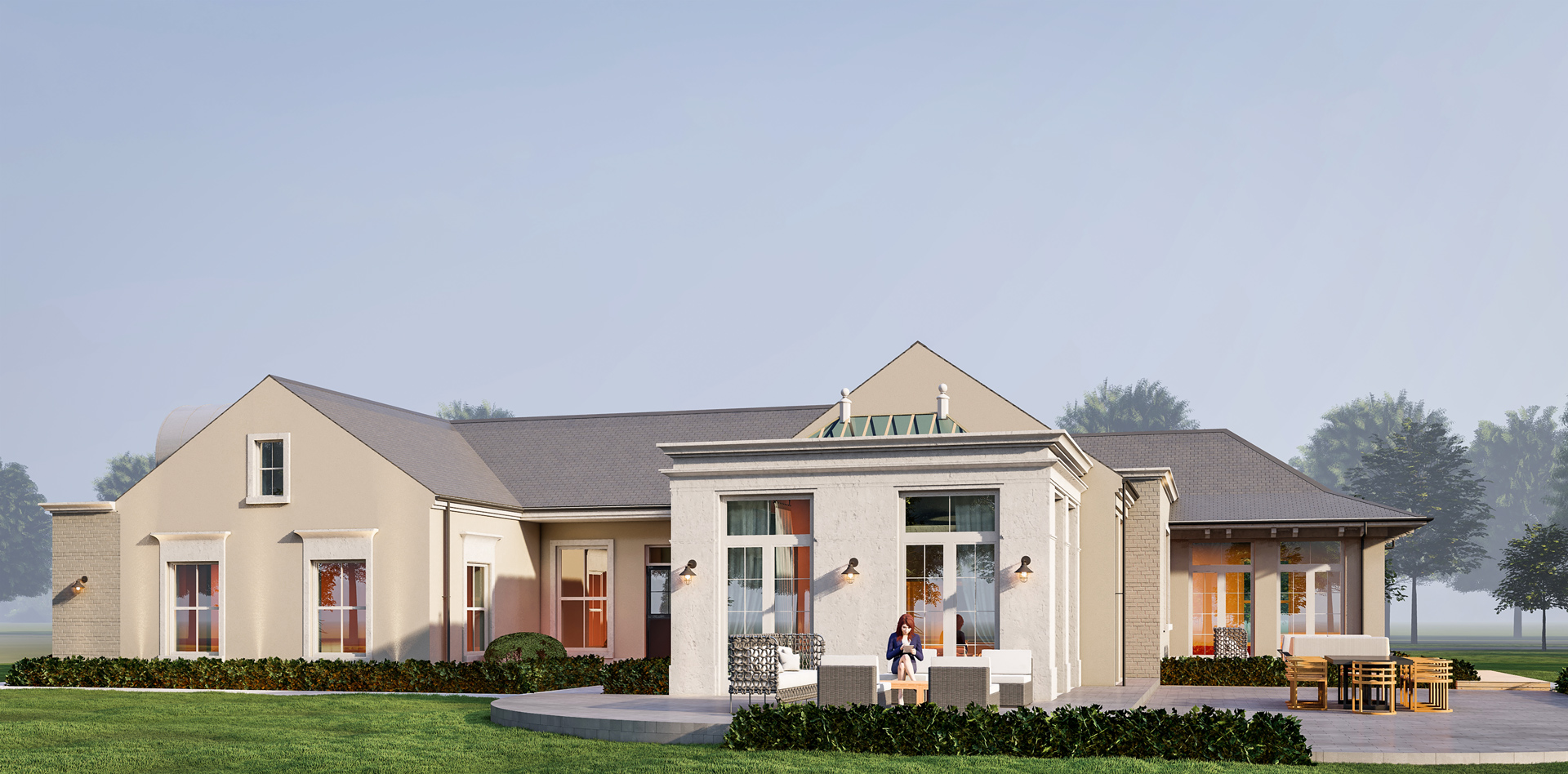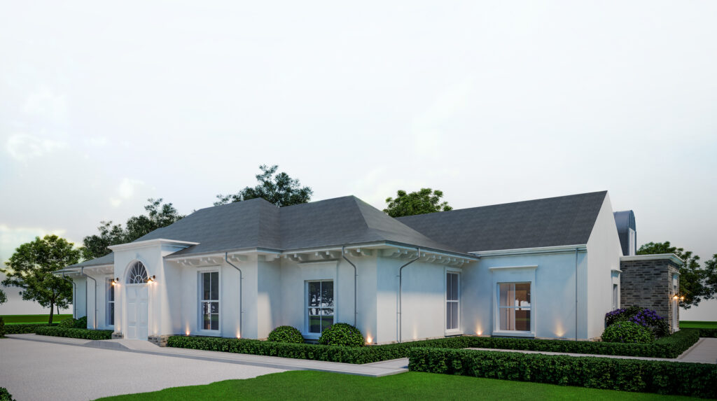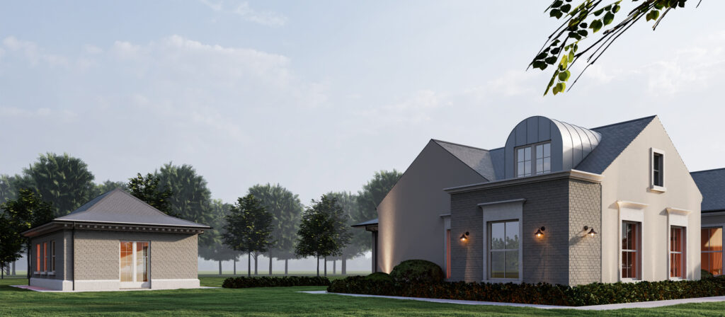 A detached pavilion-style outbuilding with hipped roof and classical detailing completes a courtyard arrangement, combining formality with functionality in a cohesive and beautifully balanced design.