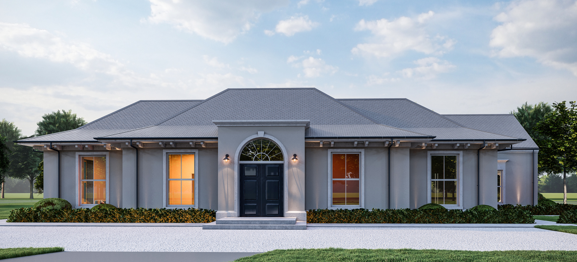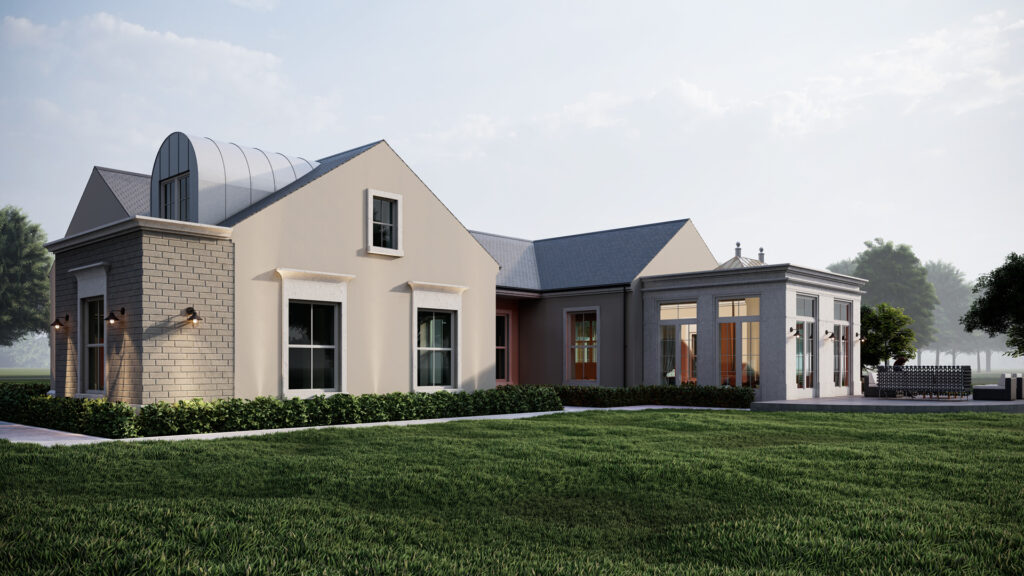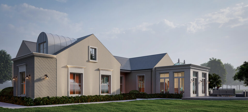 The house is primarily single storey, with a striking zinc-clad barrel dormer adding interest and light to the rear dormer element. A symmetrical front elevation is anchored by a central decorative porch, creating a strong focal point on approach. Refined detailing to the roof edges, window surrounds, and parapets lends a sense of quality and craftsmanship throughout.