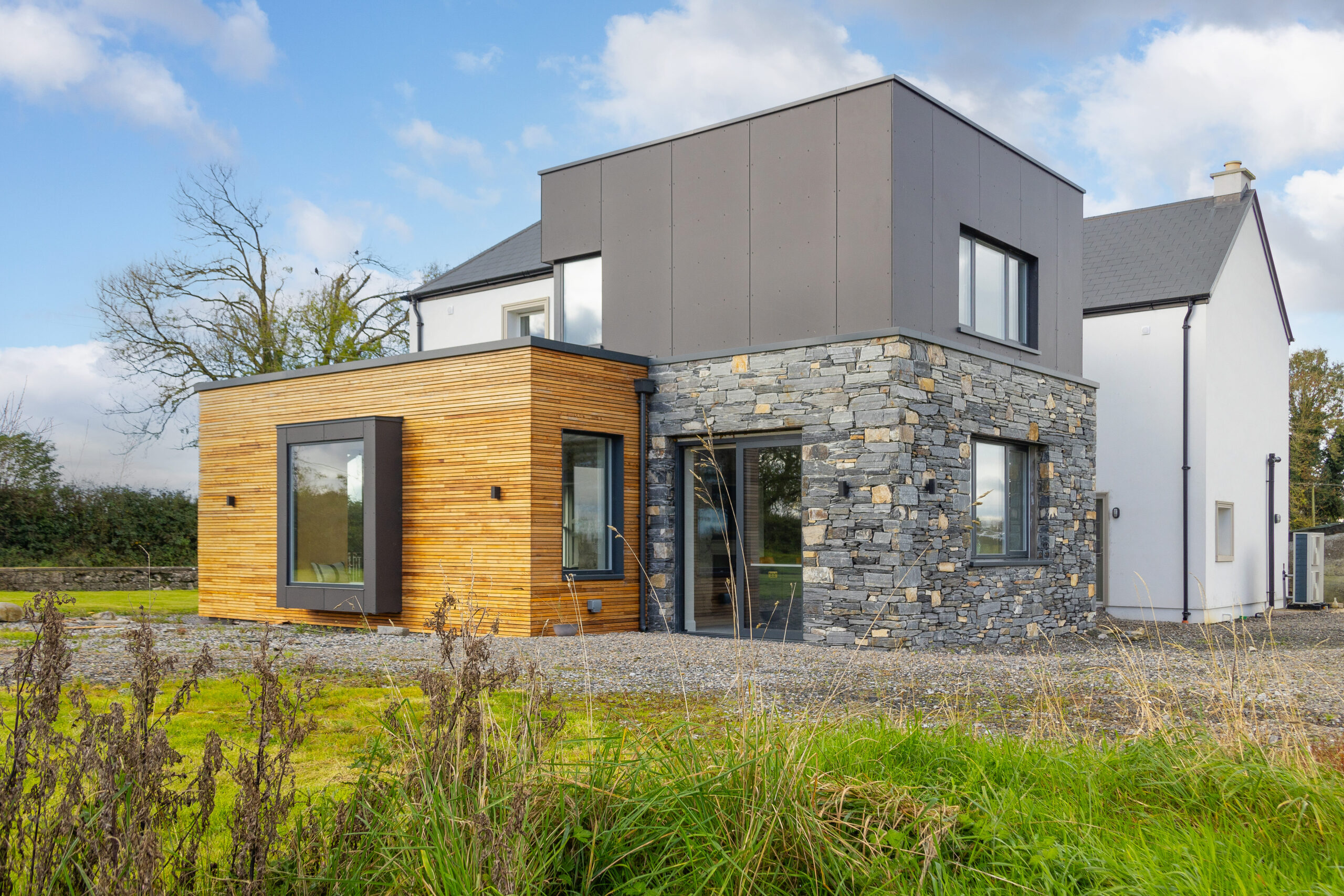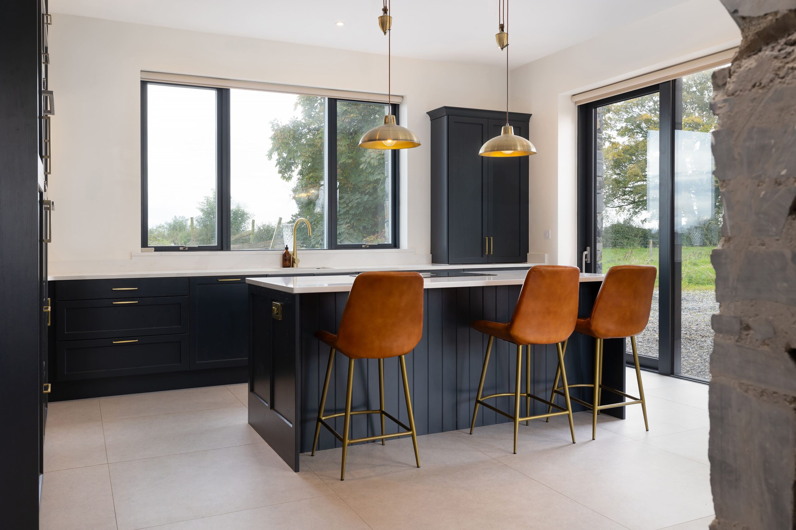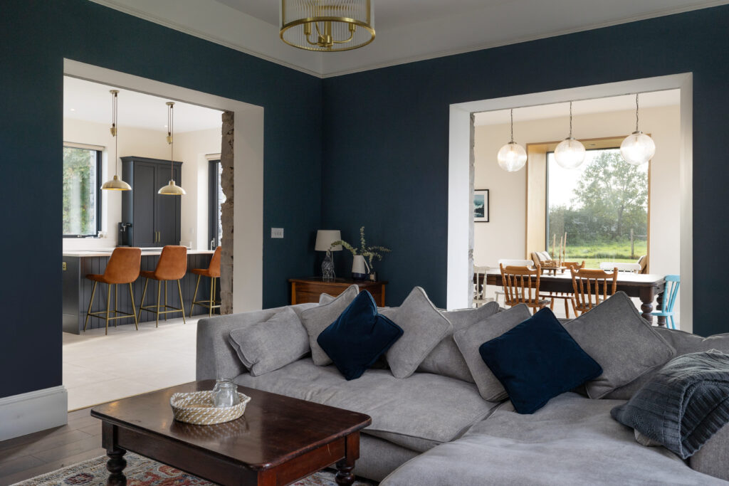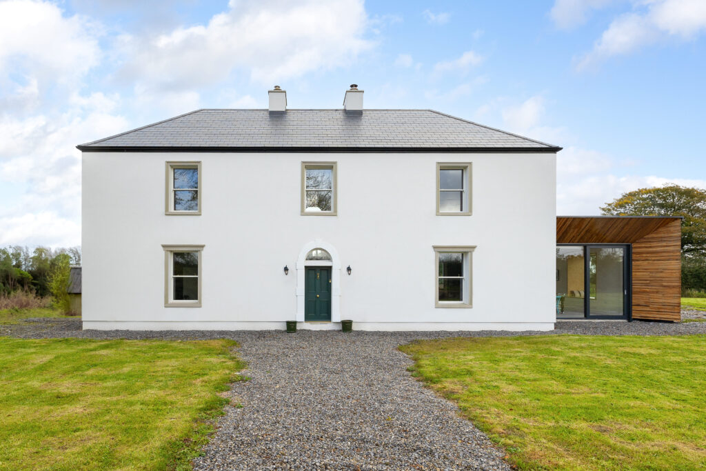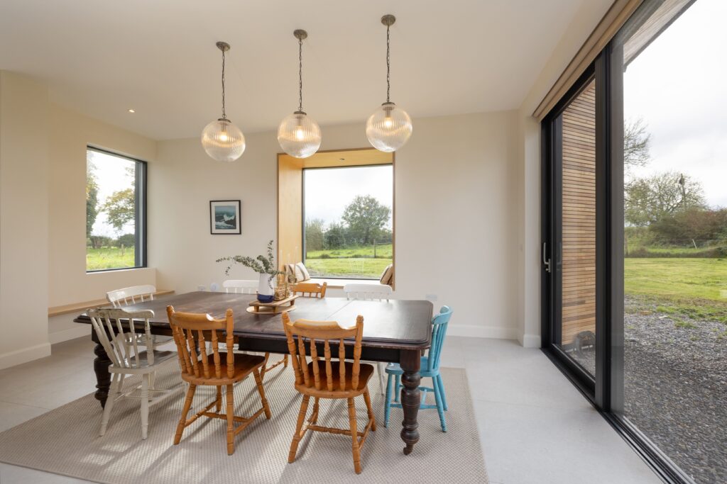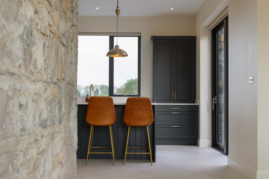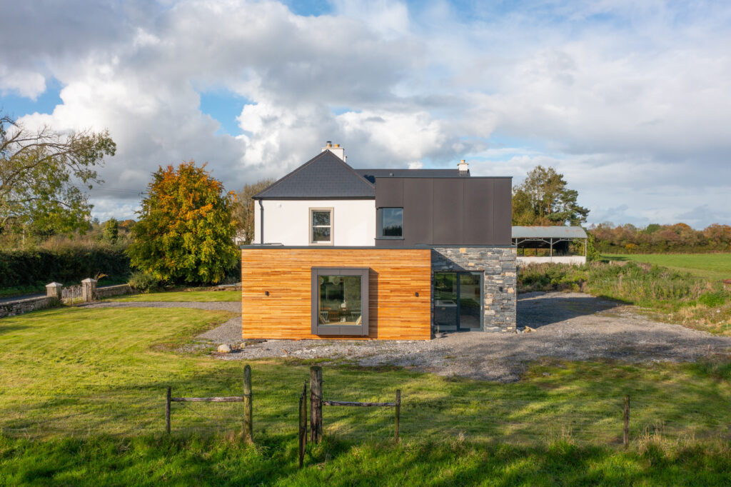 A modern extension was carefully designed to respect the farmhouse’s prominence. Stepped back from the original structure, its ground floor is clad in natural timber, complementing the rural setting, while the upper level features a sleek black Equitone finish, creating a refined contrast.