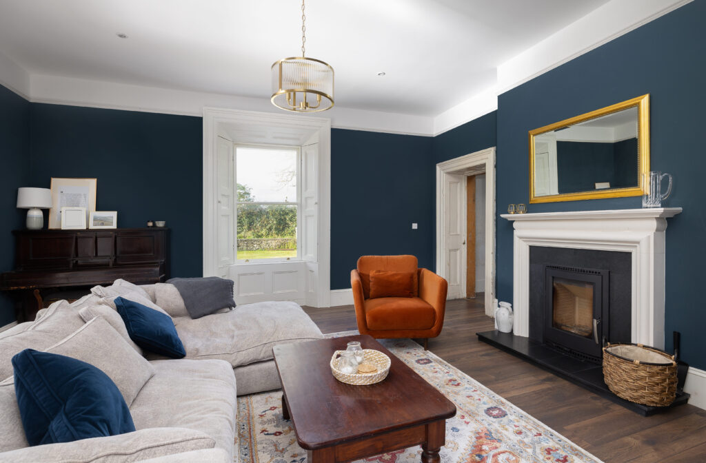 Structurally, the stone walls remained sound, but the roof required full replacement. The restoration focused on conserving key elements—original timber windows, doors, and intricate cornices—while introducing contemporary design solutions.