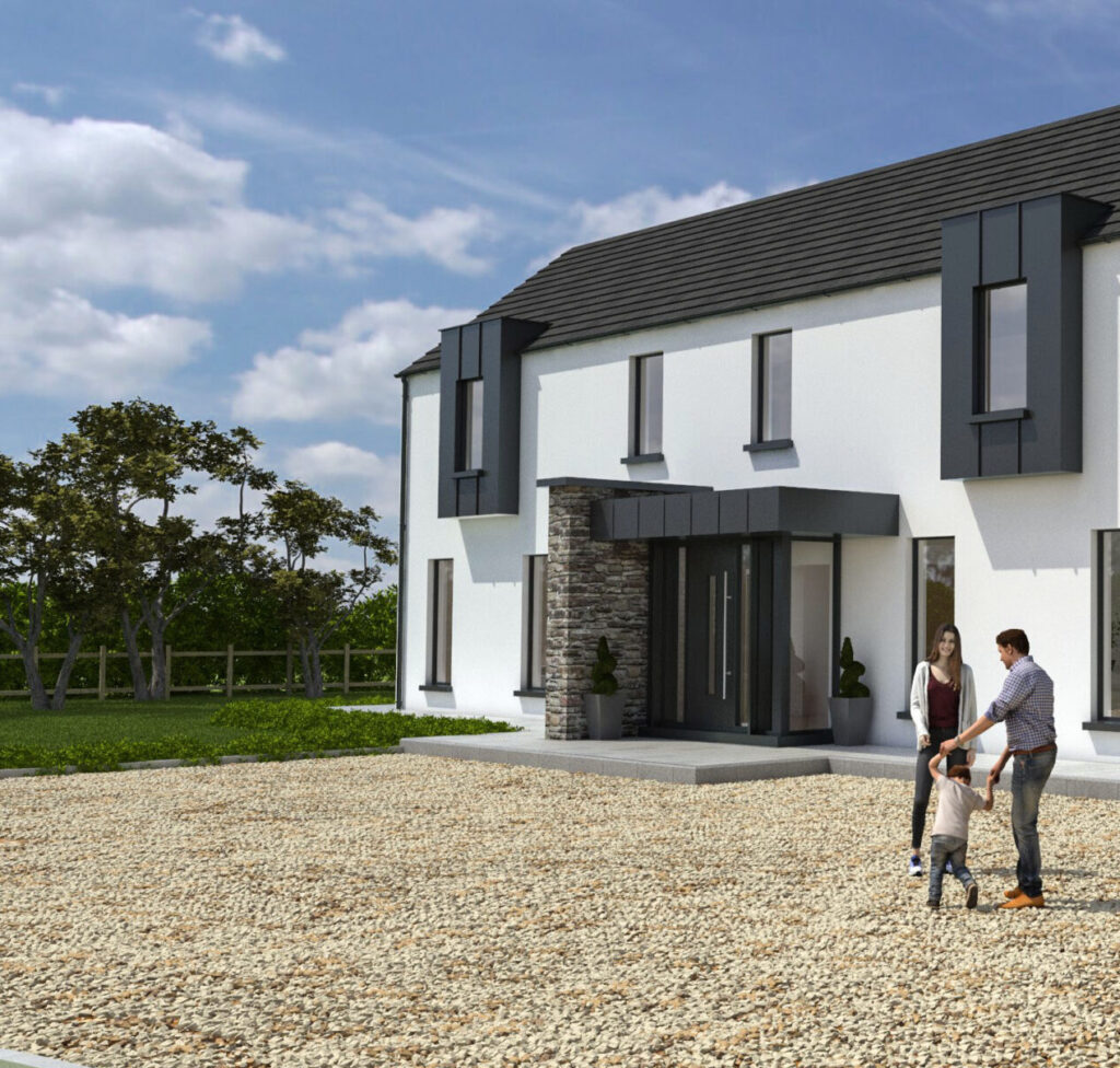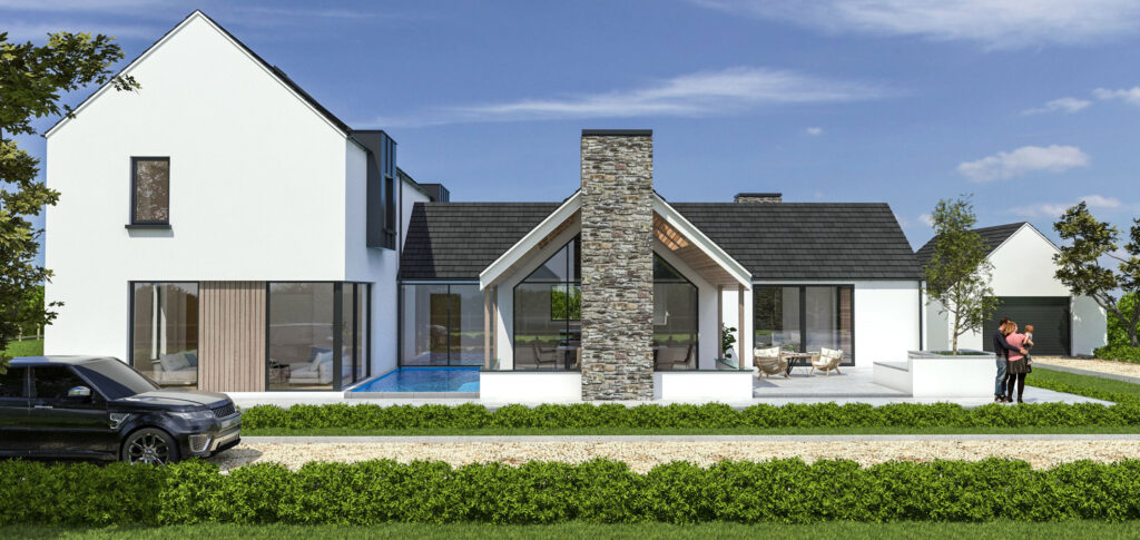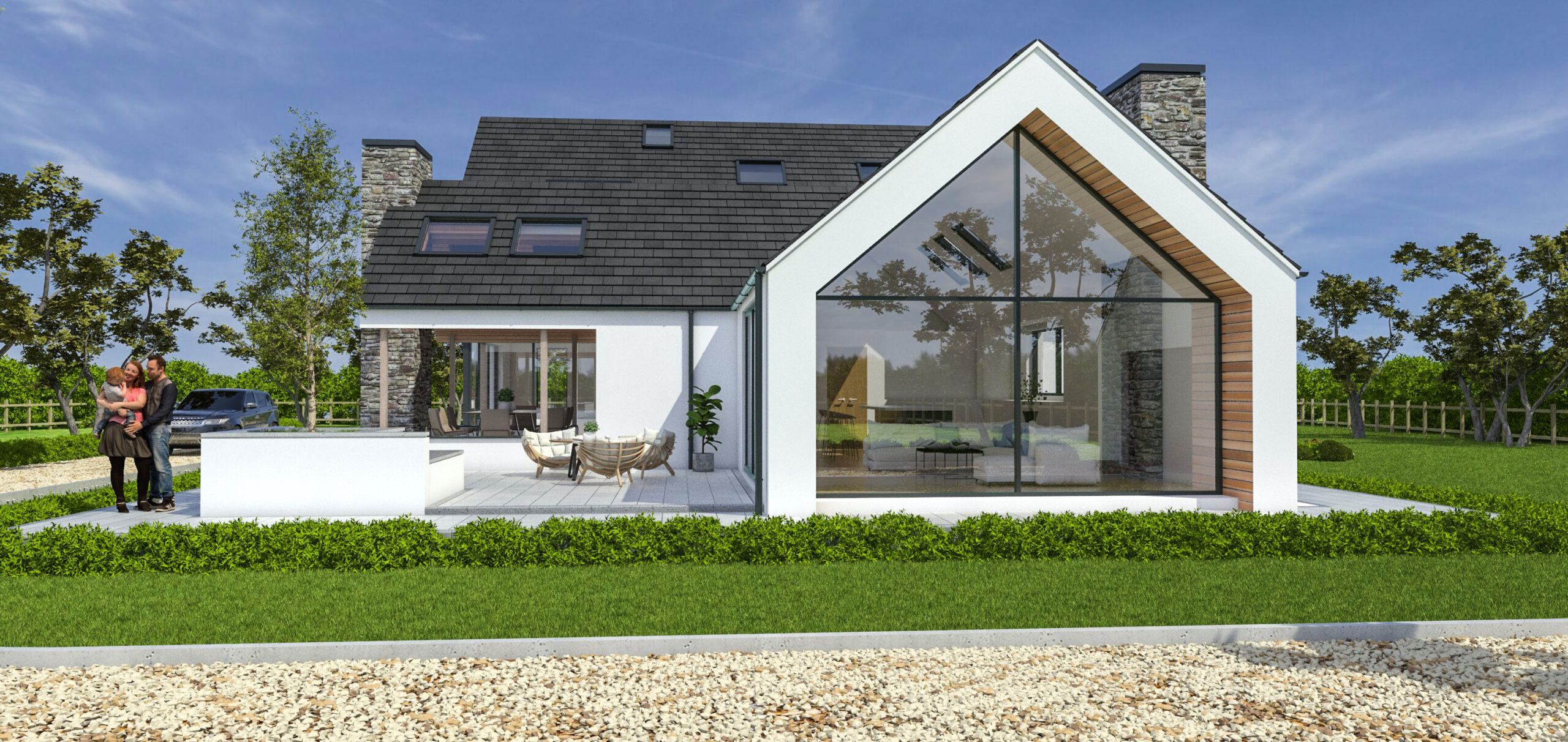 This striking contemporary home reinterprets the traditional Irish rural vernacular through a crisp modern lens. The design is arranged around two steeply pitched gabled forms, linked by a central living space that opens out to a large south-facing terrace. A prominent stone-clad chimney anchors the sheltered outdoor area, providing a natural focal point and extending the living space into the garden.