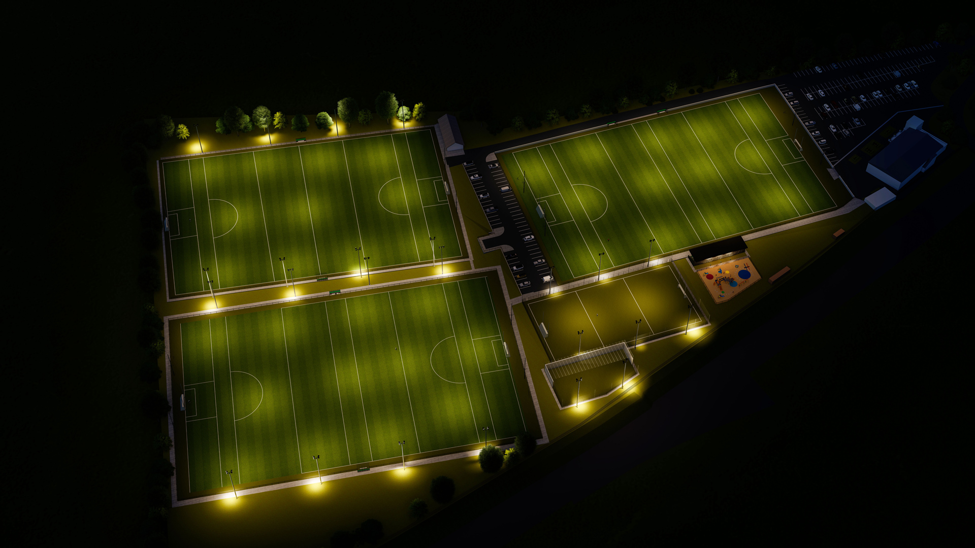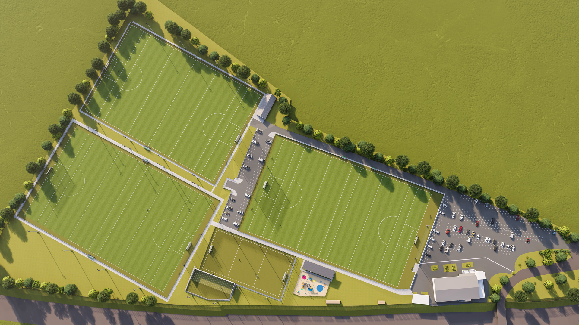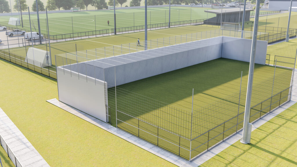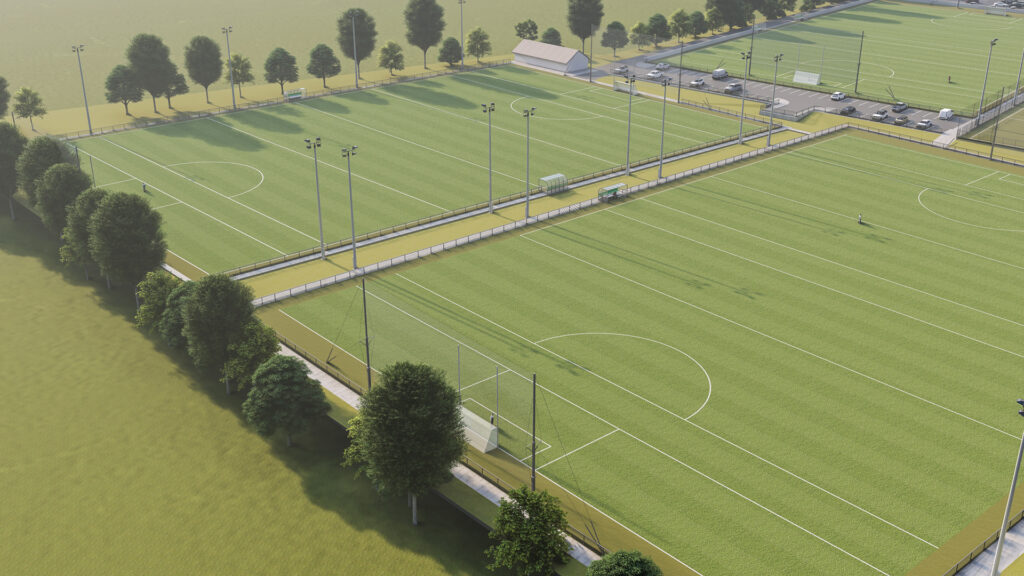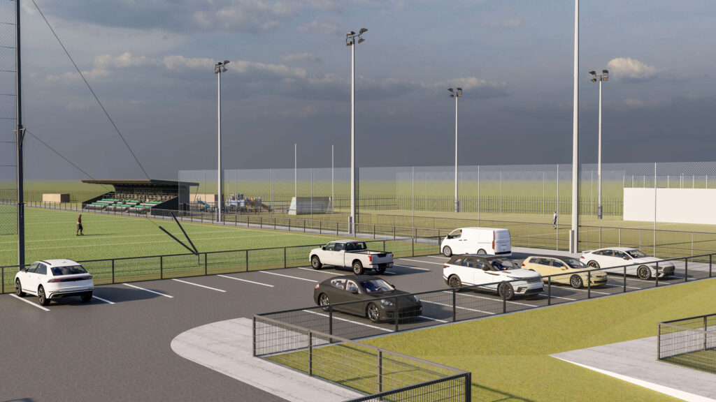 The project includes a new full-size floodlit pitch, floodlit all-weather astro pitch, walking track, covered viewing stand, skills wall, and a new children's playground — all designed to support the club’s growing membership and community engagement.