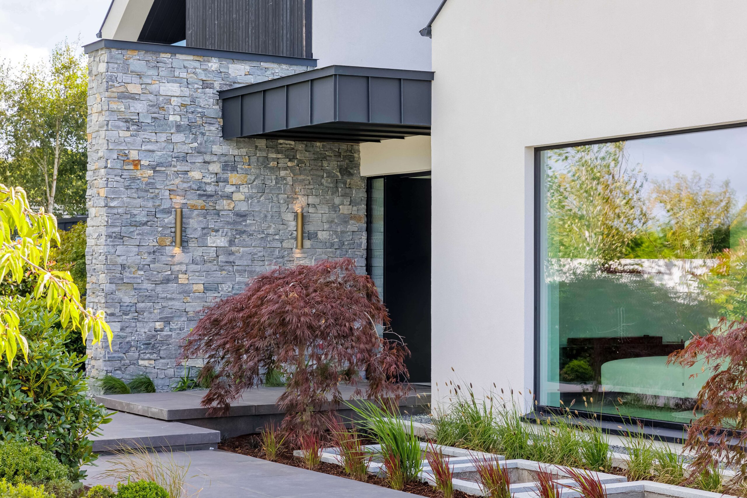 Natural stone walls and charred timber cladding provide warmth and texture, while the simple rooflines and projecting volumes give the home a confident, modern silhouette. Subtle landscaping, integrated lighting, and generous glazing anchor the house beautifully within its private, mature garden setting.