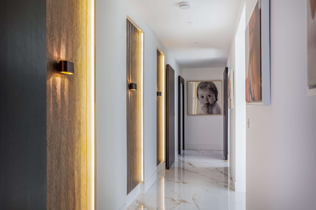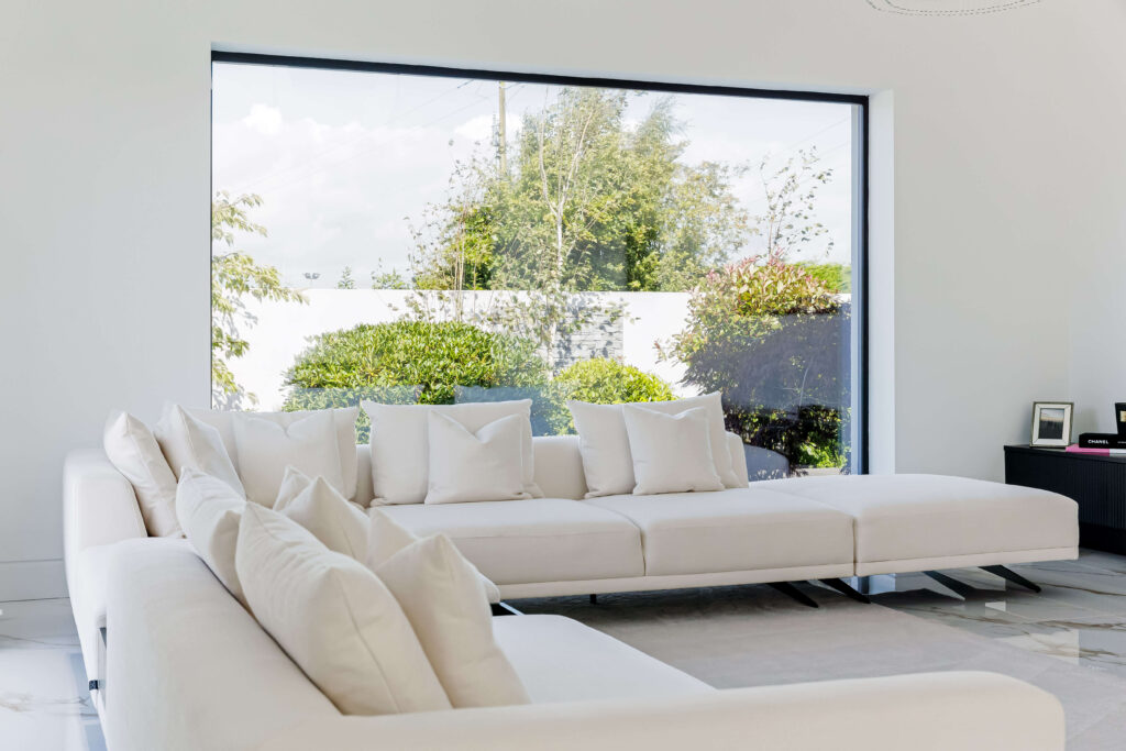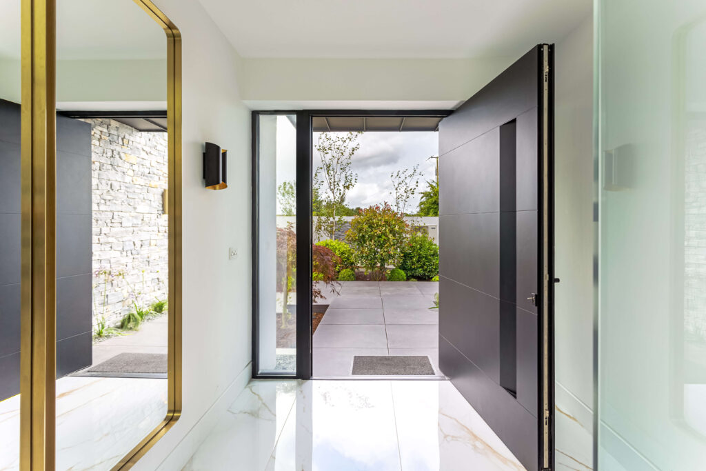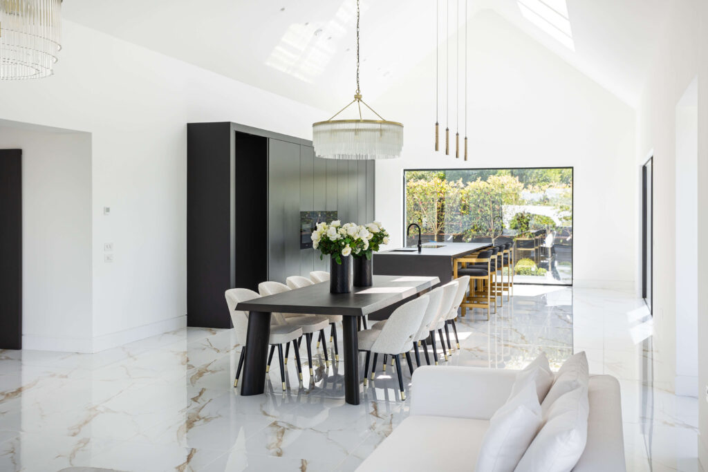 Internally, the palette is crisp and luxurious. A dramatic pivot front door opens into a bright, high-ceilinged entrance hall finished in polished marble tiles, setting a calm and elegant tone. The open-plan kitchen and dining space continues the monochrome theme with full-height matte black cabinetry, gold-accented seating, and minimalist pendant lighting.