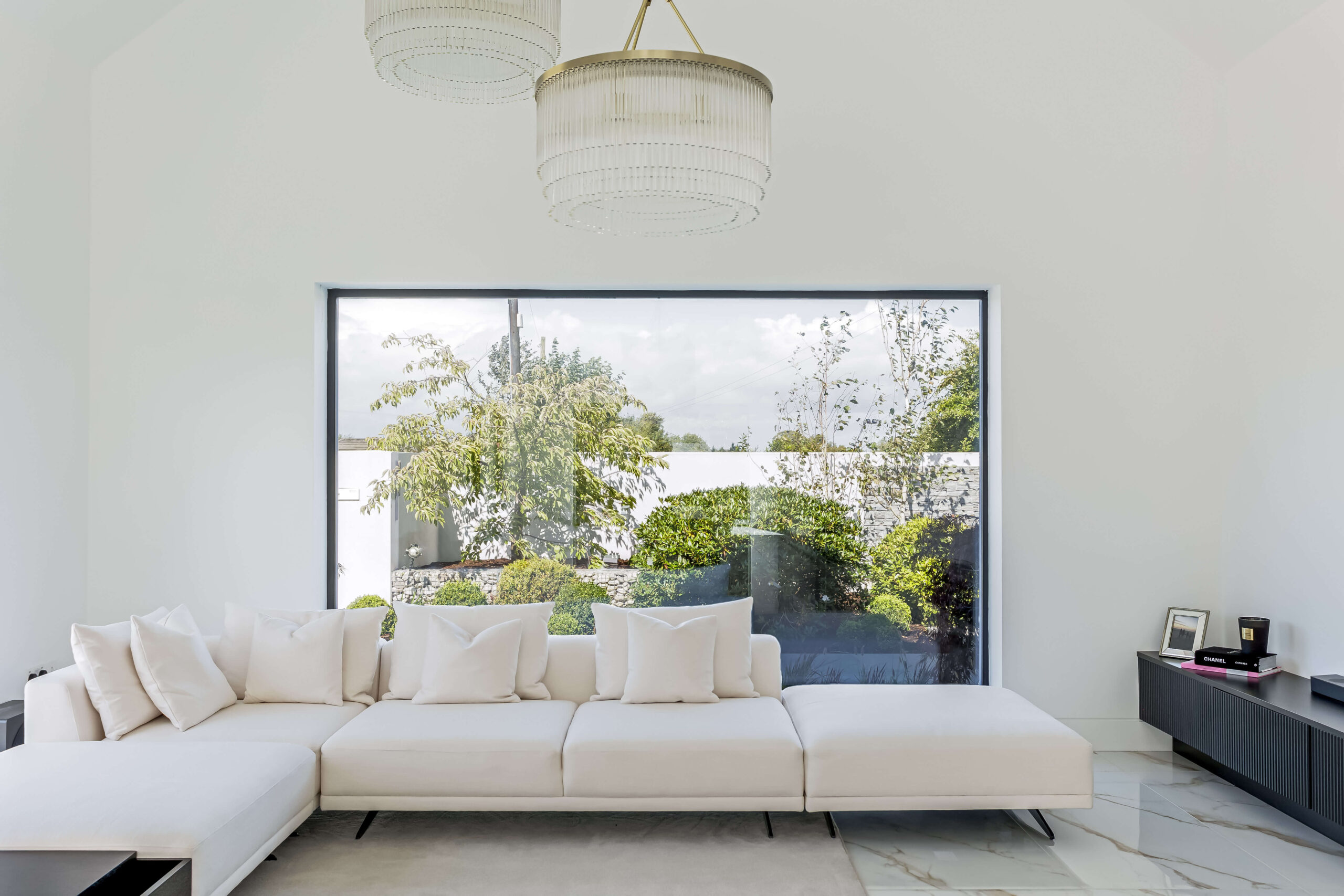 Large-format windows frame lush garden views, creating a seamless indoor-outdoor connection throughout.