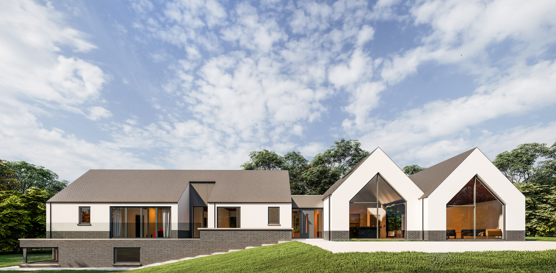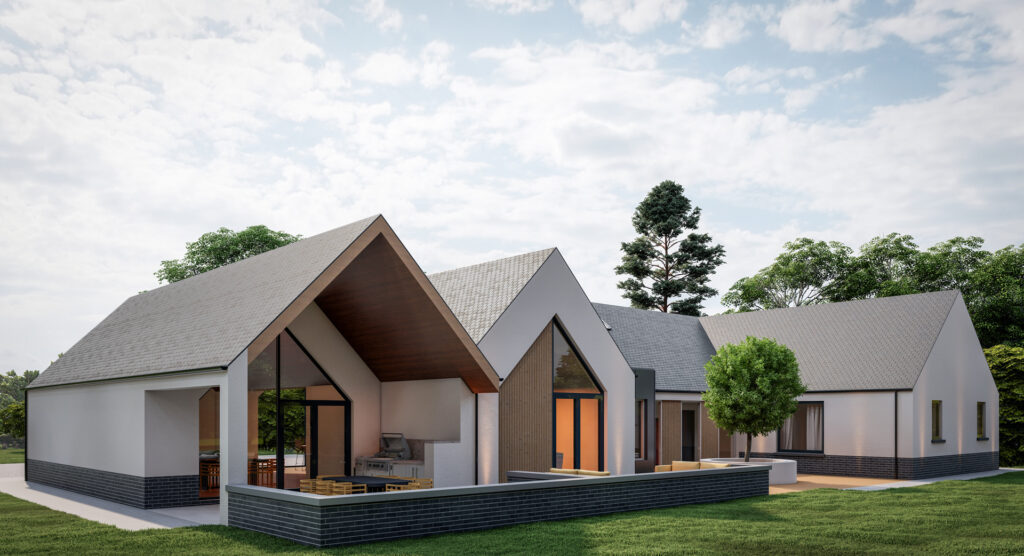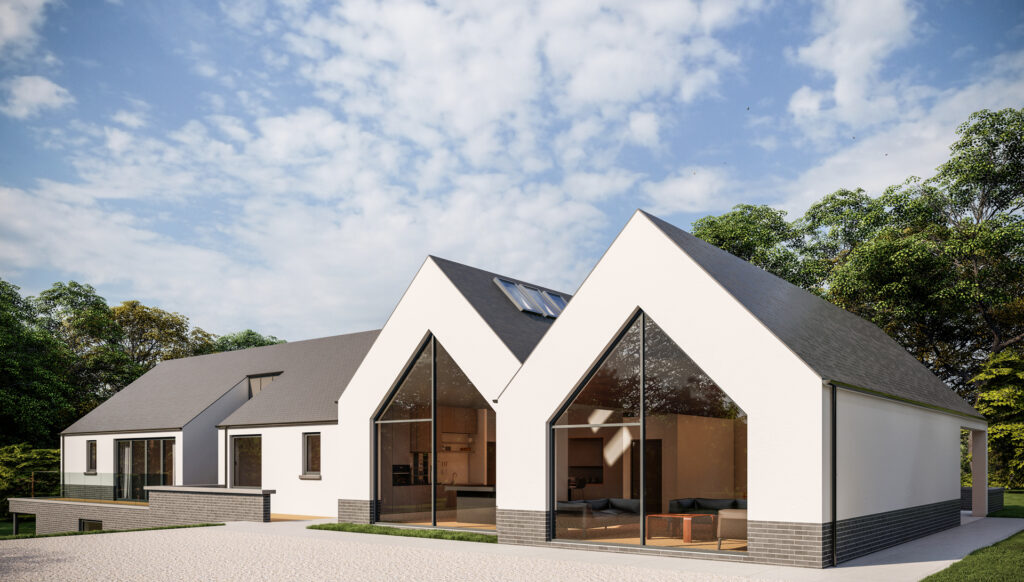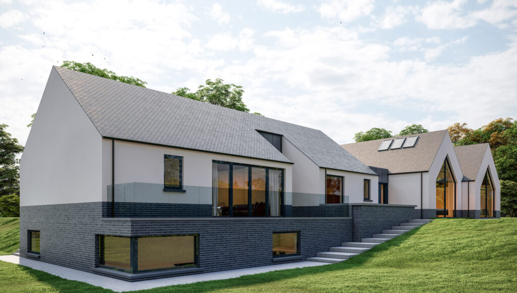 The use of white render and dark brickwork grounds the building and gives it a contemporary yet timeless feel. The main living spaces are housed within vaulted roof forms, adding drama and scale while maintaining a simple, rural aesthetic. A lower ground floor level provides additional accommodation with direct garden access. Carefully considered solar orientation and integrated passive design measures ensure the home performs efficiently throughout the year, capturing solar gain in winter while avoiding overheating in summer. The result is a striking yet practical family home that makes the most of its setting