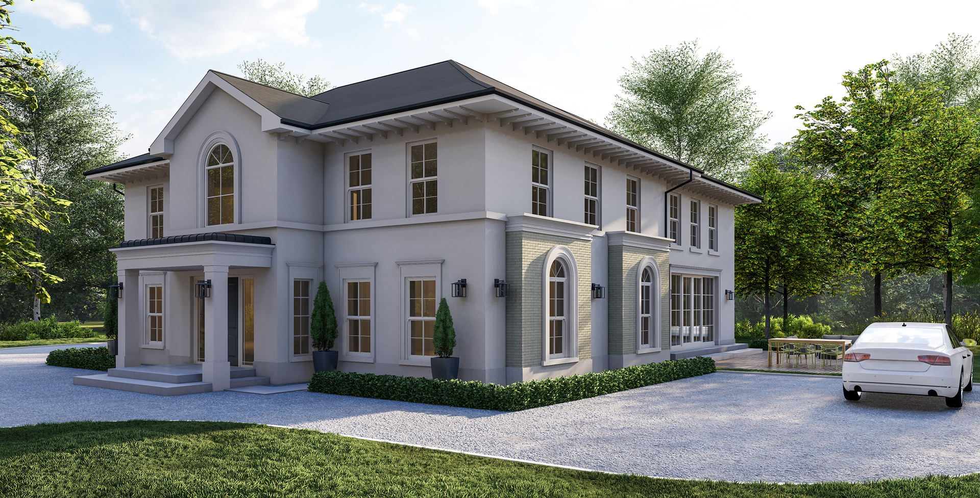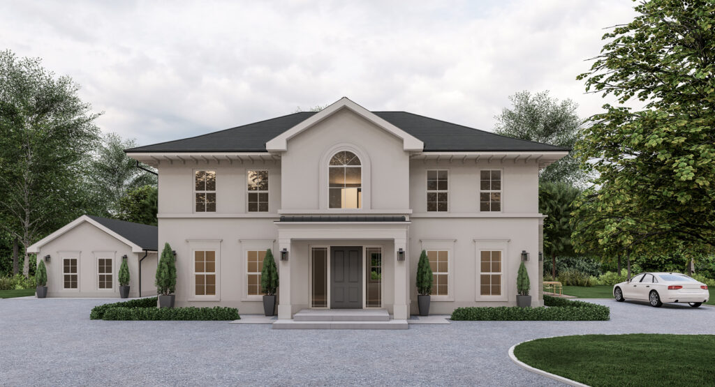 The side elevation is expanded with large-format glazing and a generous outdoor terrace, enhancing the connection between the main living areas and the surrounding landscape. Together, these upgrades transform the house into a sophisticated, light-filled residence with a clear architectural identity rooted in Georgian tradition but expressed through a modern lens.