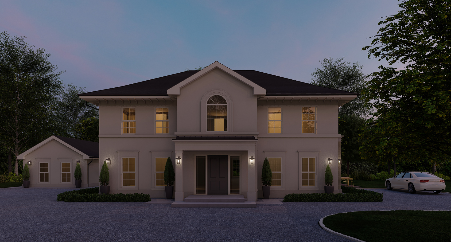 One of the standout features is the crisp parapet line and deep roof overhang, which introduce a sense of classical grandeur while also adding shadow depth and visual interest. The addition of textured brick panels, arched window reveals, and high-spec external lighting contribute to the home's timeless quality.