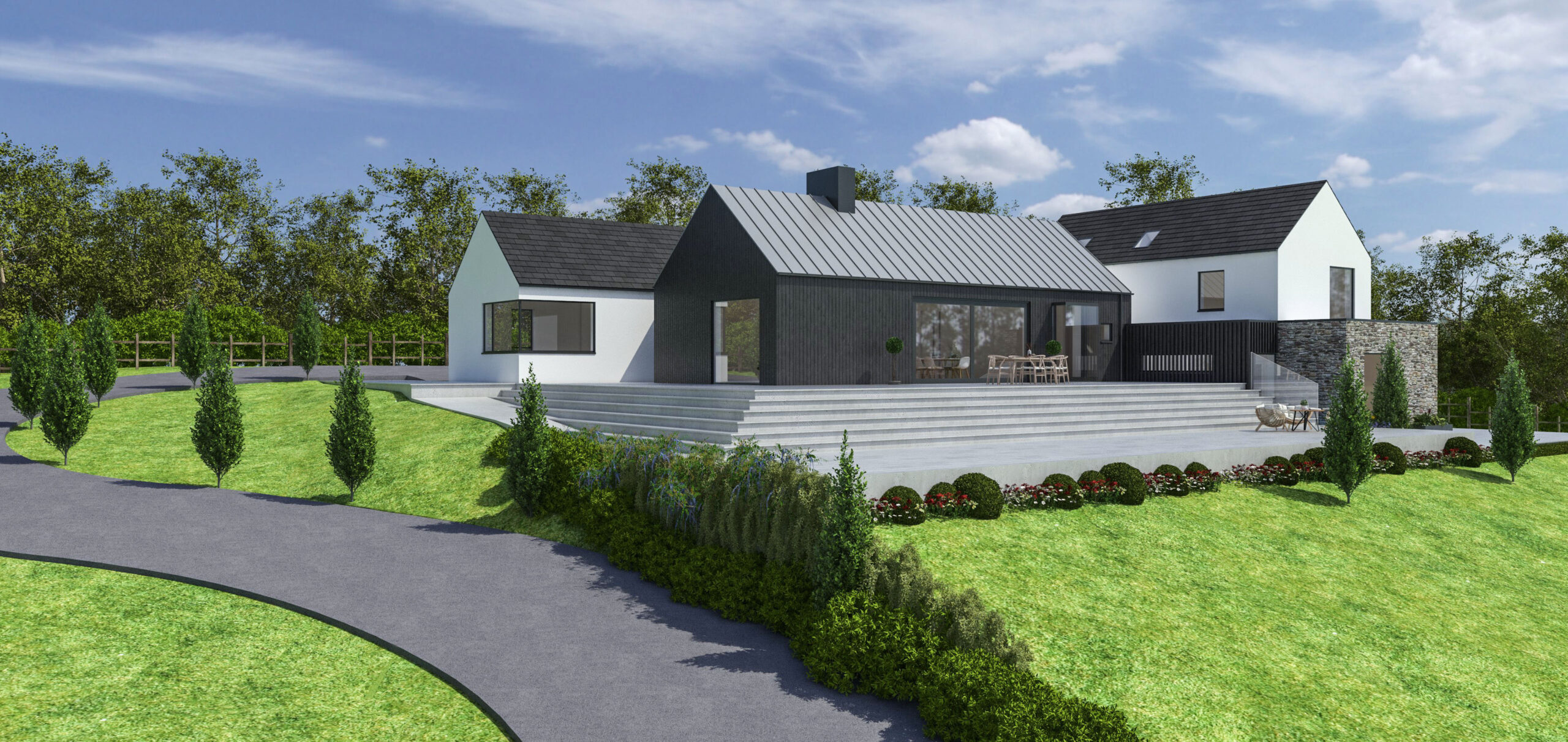 Perched on an elevated rural site with sweeping views across Limerick City, this newly constructed family home blends refined contemporary architecture with the rhythms of the surrounding landscape. The design adopts a restrained, elegant composition of pitched forms and interlinking volumes, reflecting traditional rural typologies in a modern interpretation.