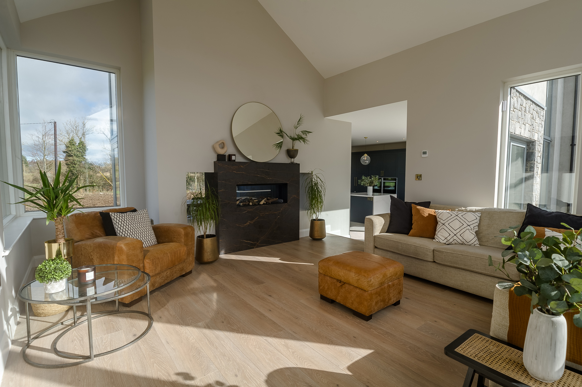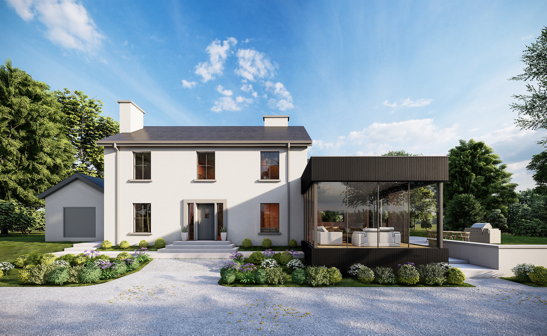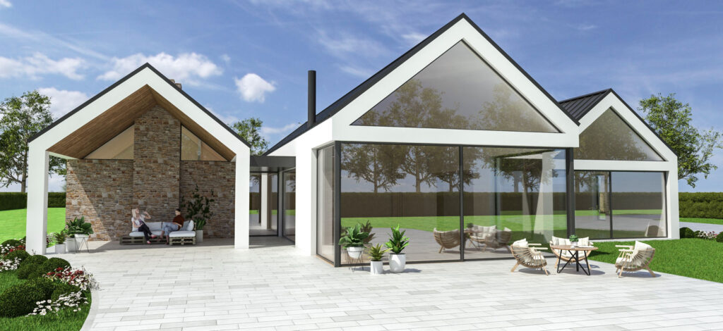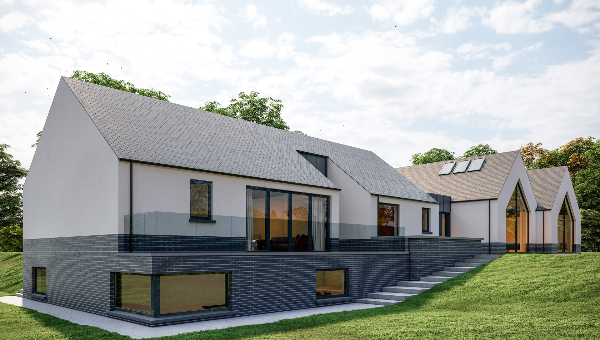 This contemporary home is defined by a striking arrangement of gabled forms, creating a clean yet sculptural architectural language. A mix of crisp white rendered walls, natural stone, and vertical timber cladding softens the strong geometry, embedding the house comfortably within its rural setting. Large sections of floor-to-ceiling glazing are used to frame garden views, flood interiors with natural light, and promote a seamless indoor-outdoor connection. An elegant link corridor of full-height glass separates the primary living spaces from the more private bedroom wing, enhancing light flow while creating a sense of calm and clarity. The centrally located outdoor room—with a pitched roof and stone backdrop—acts as a sheltered retreat, ideal for year-round use. Timber-lined ceilings and soft landscaping complete the carefully considered design. RSDS provided all architectural services and 3D visualisation for this bespoke home, which balances a rural vernacular influence with a refined modern aesthetic