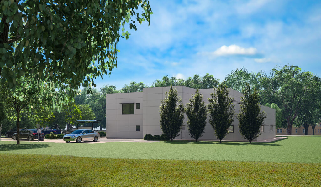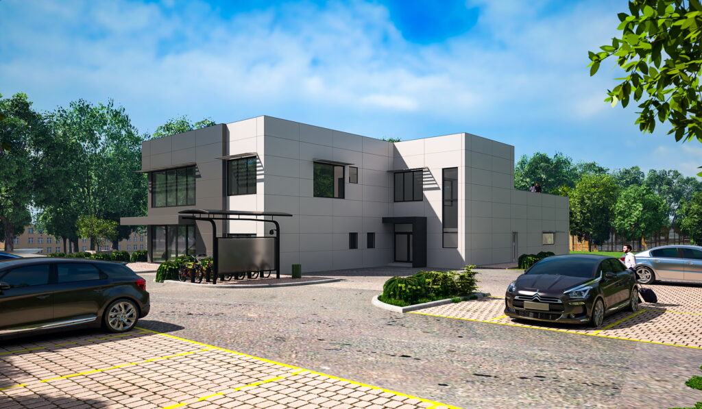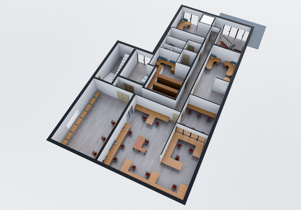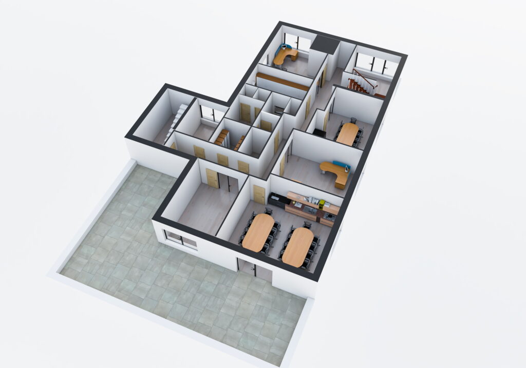 A mix of crisp white rendered walls, natural stone, and vertical timber cladding softens the strong geometry, embedding the house comfortably within its rural setting. Large sections of floor-to-ceiling glazing are used to frame garden views, flood interiors with natural light, and promote a seamless indoor-outdoor connection. An elegant link corridor of full-height glass separates the primary living spaces from the more private bedroom wing, enhancing light flow while creating a sense of calm and clarity. The centrally located outdoor room—with a pitched roof and stone backdrop—acts as a sheltered retreat, ideal for year-round use.
