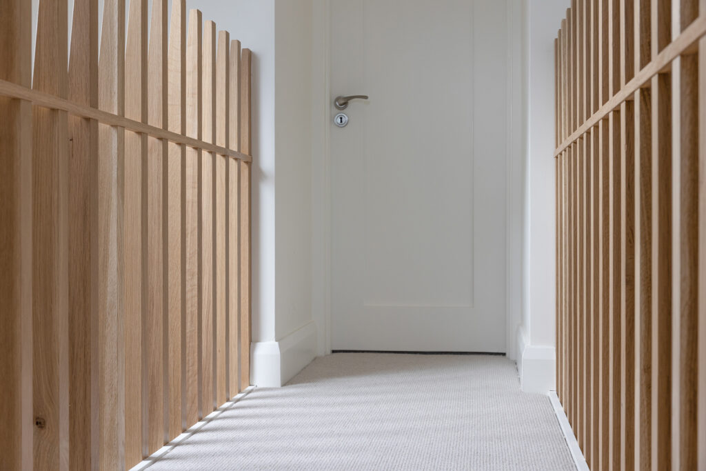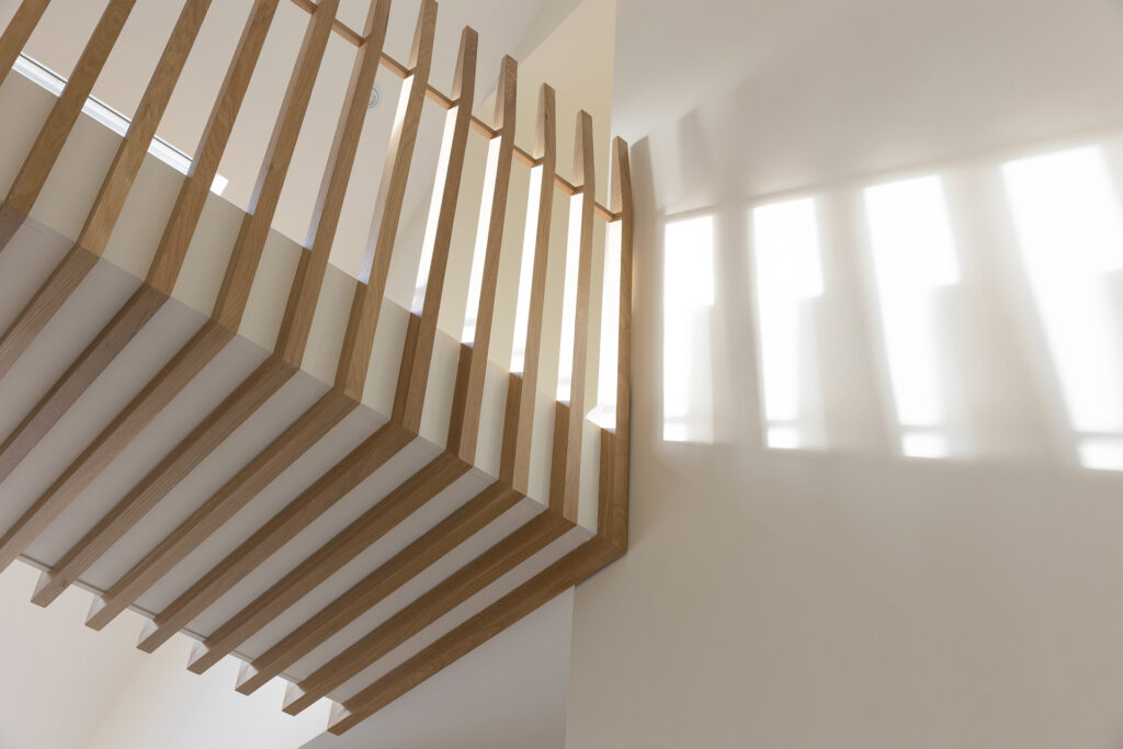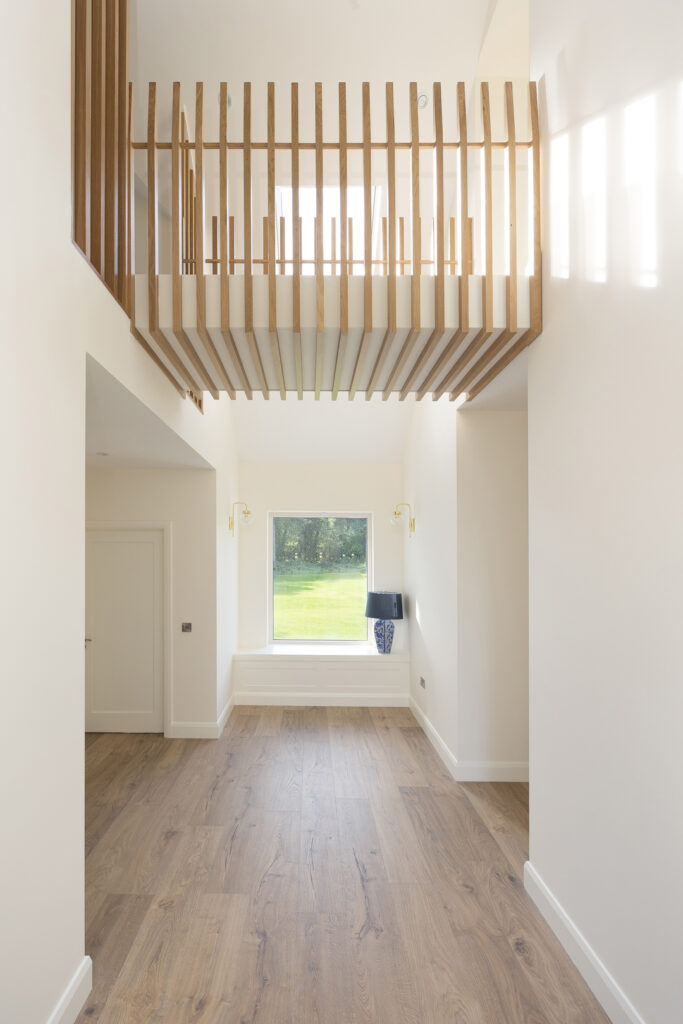 A key architectural feature is the bespoke timber bridge overlooking the entrance space, linking the master suite to a home office.