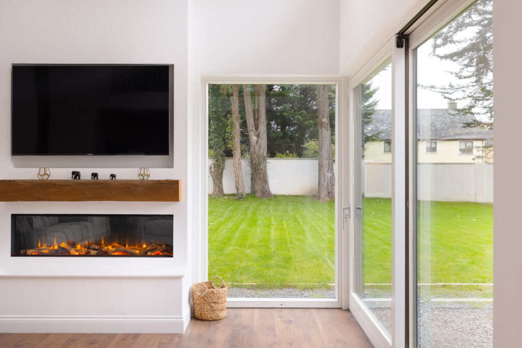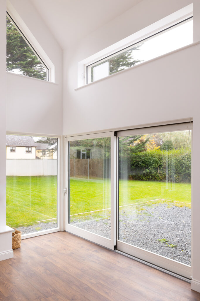 Large sliding glass doors and expansive windows strengthen the connection between interior spaces and the mature surrounding landscape, facilitating seamless indoor-outdoor living.