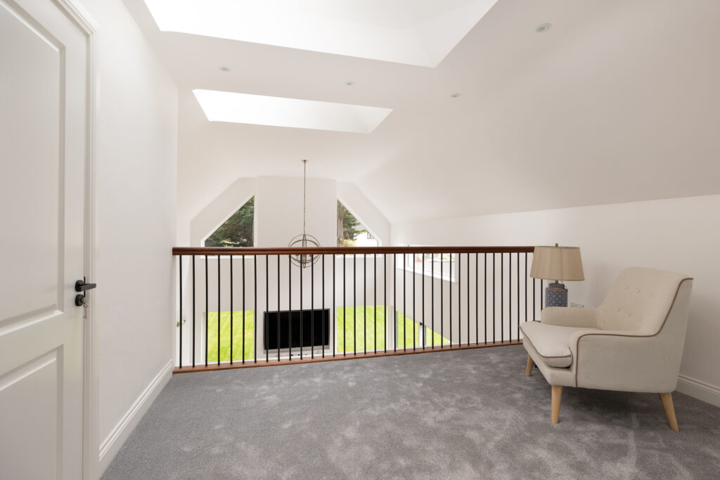 Inside, the extension houses a double-height living area illuminated by clerestory windows, fostering an airy ambiance. A mezzanine above the kitchen offers additional functional space while maintaining openness.