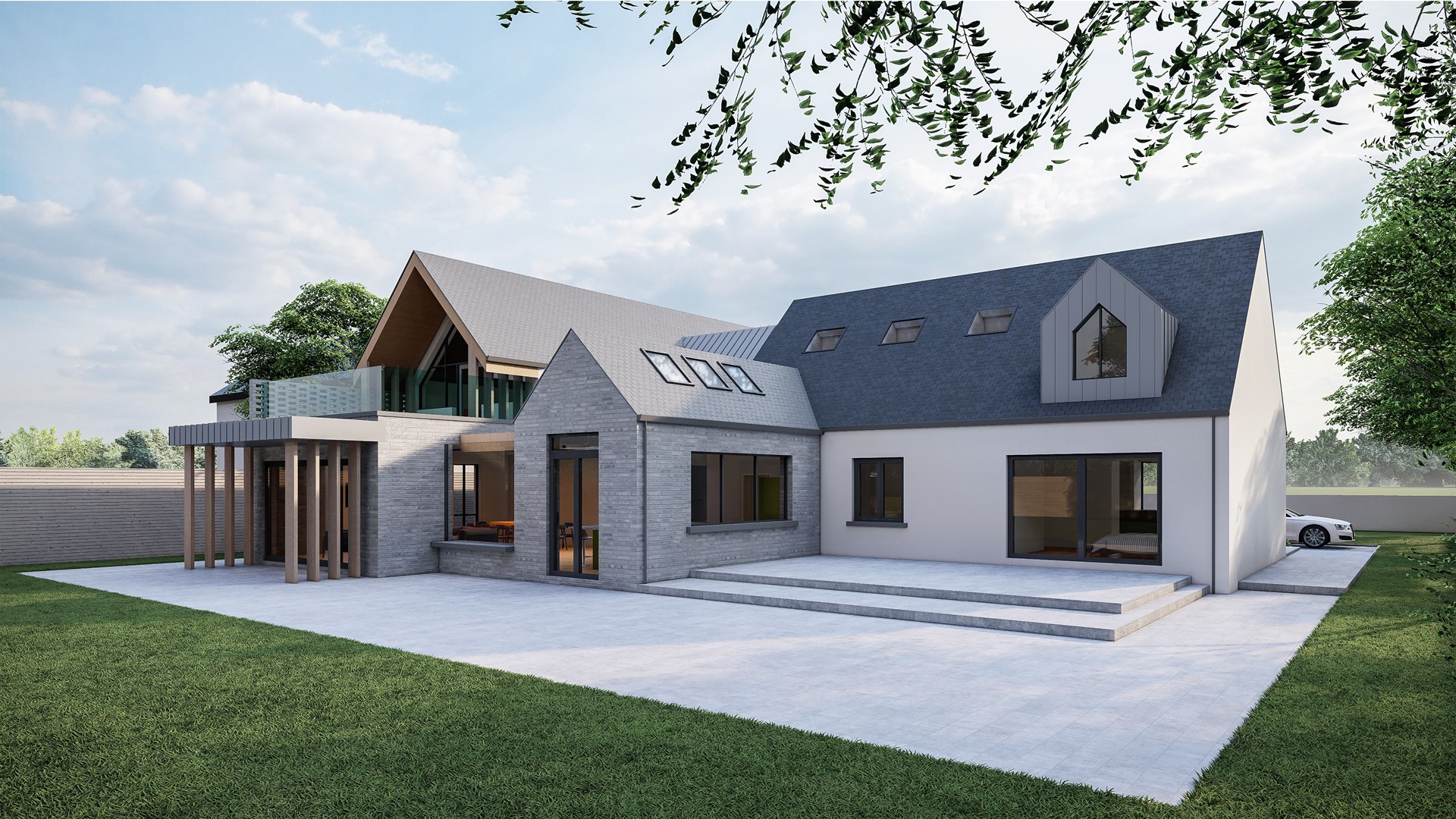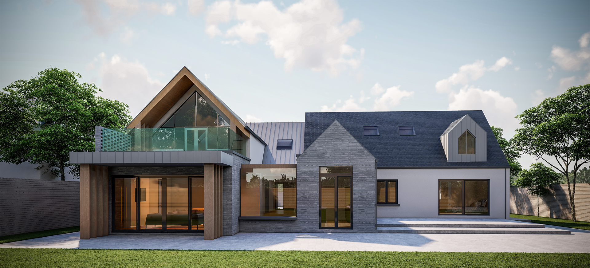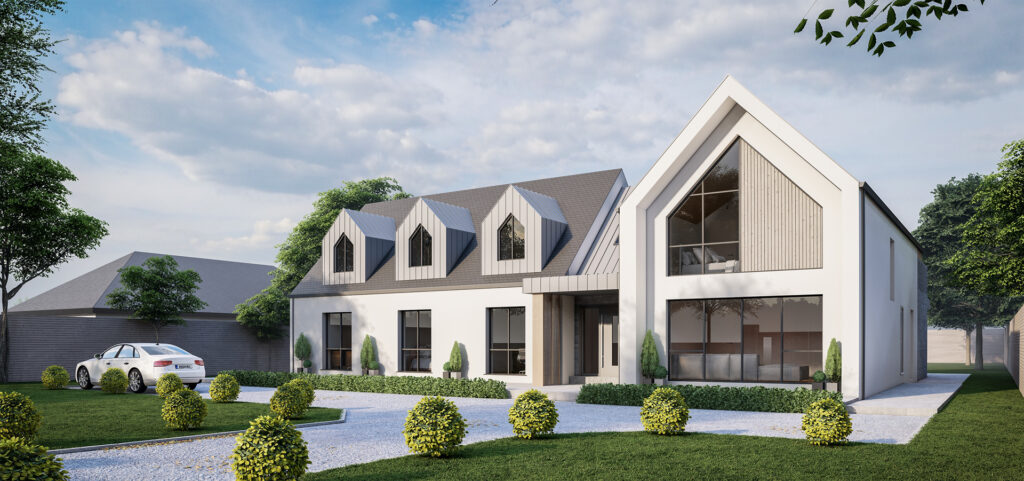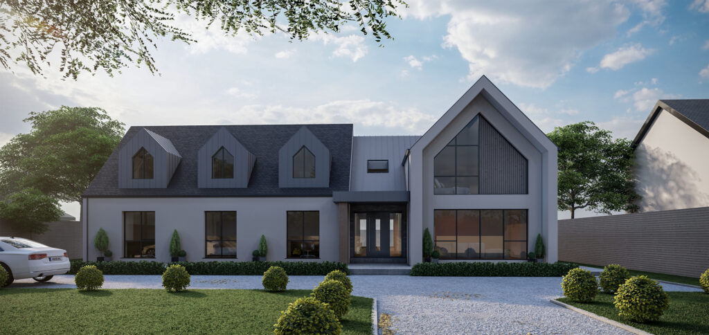 This striking contemporary home presents a modern interpretation of the traditional Irish dormer dwelling. The design is defined by a strong gabled form, expressed in crisp white render and vertical timber cladding, complemented by zinc-clad dormers that introduce depth and rhythm across the main roofscape. Large-format glazing with slim frames maximises natural light while framing views of the garden, creating a seamless connection between interior and exterior.