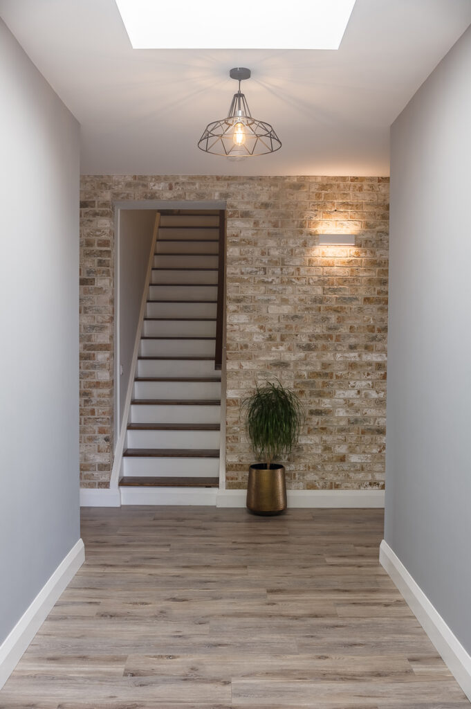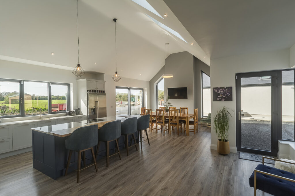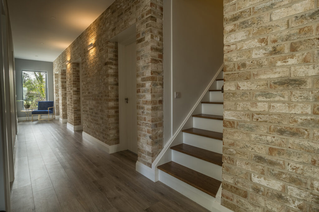 Materials such as natural stone, timber cladding, and natural slate roofing were carefully selected to blend the home seamlessly with its rural surroundings. Inside, features like a brick-lined hallway and varied ceiling heights add character and define distinct zones within the open-plan layout.