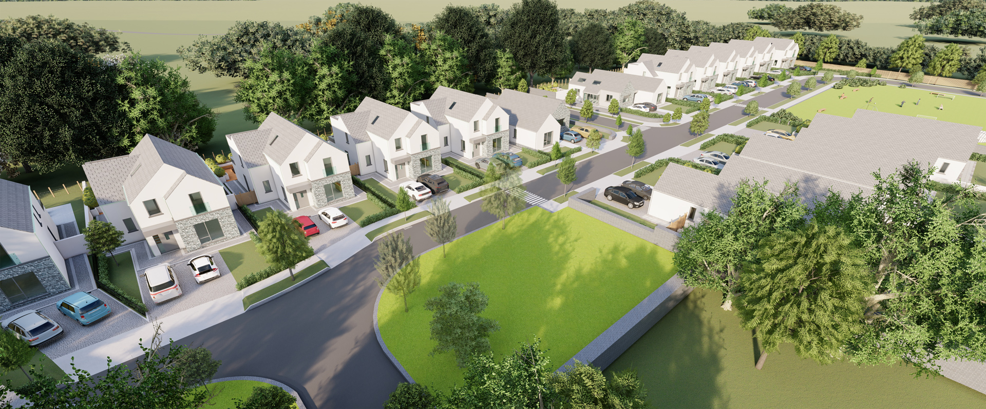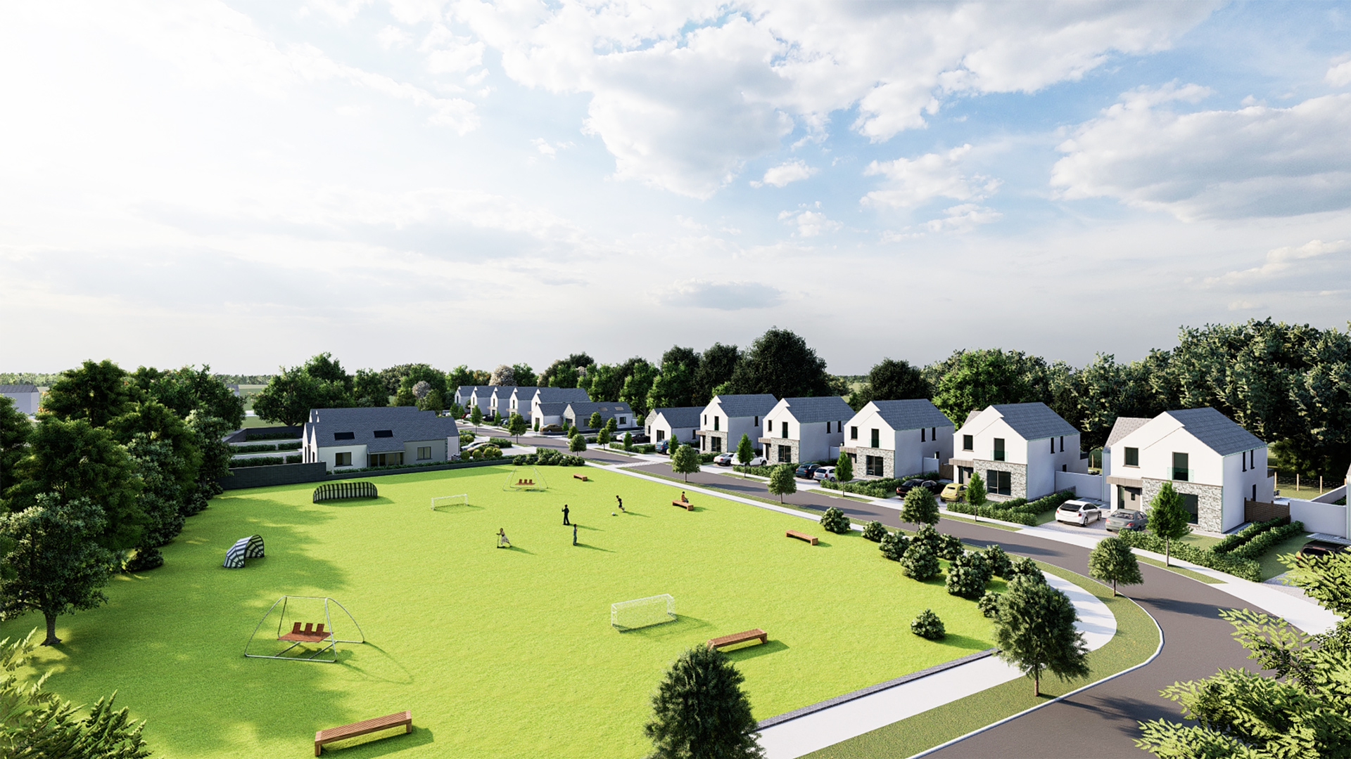 The scheme provides generous private gardens for each home, while the majority of dwellings overlook a large public open space, creating a strong sense of community. Access is through an existing estate, integrating the development seamlessly into its surroundings.